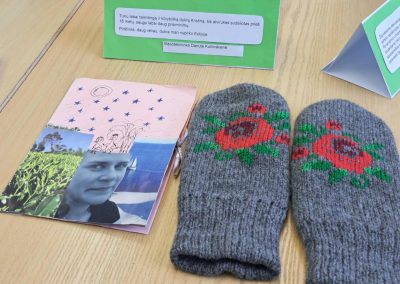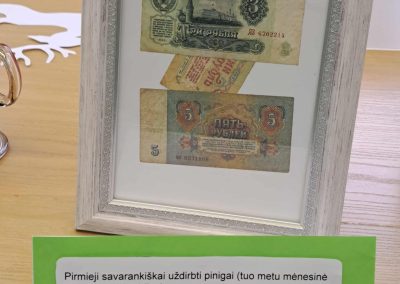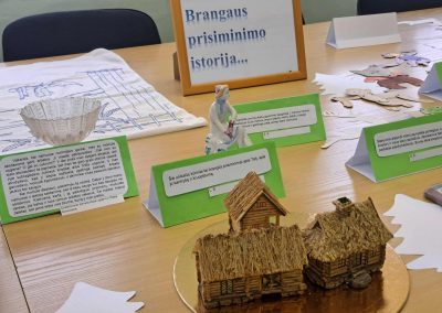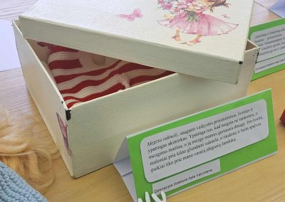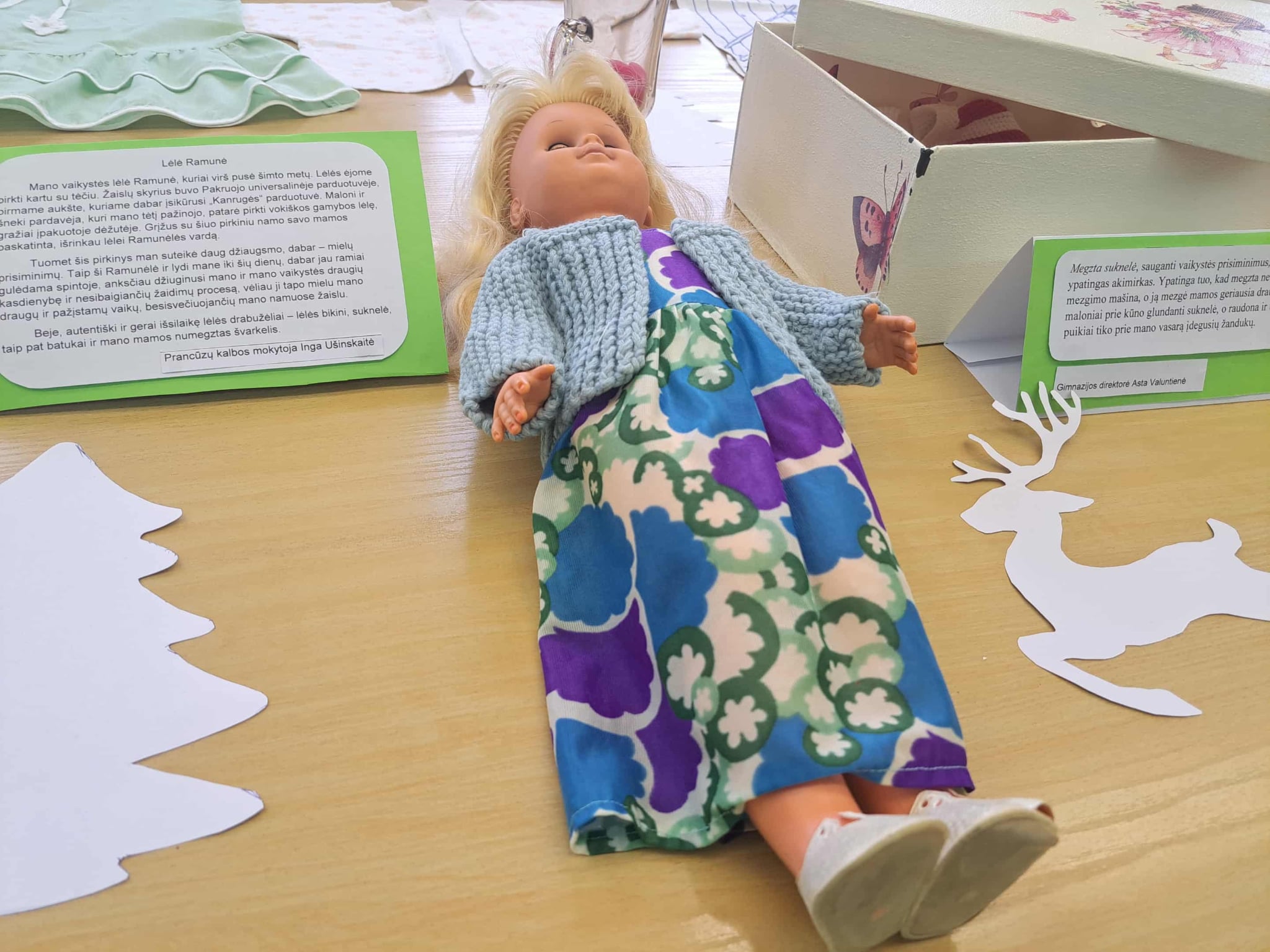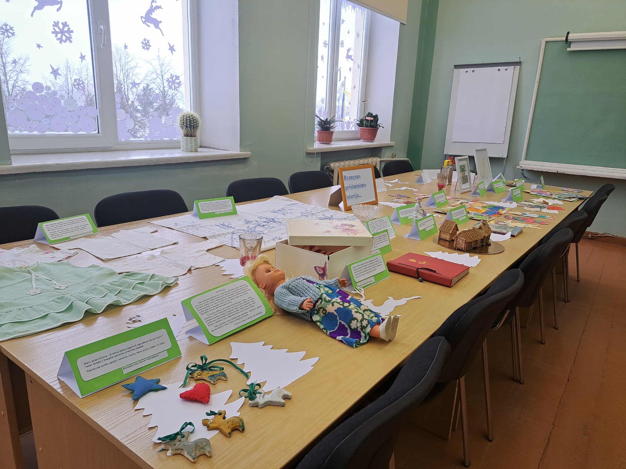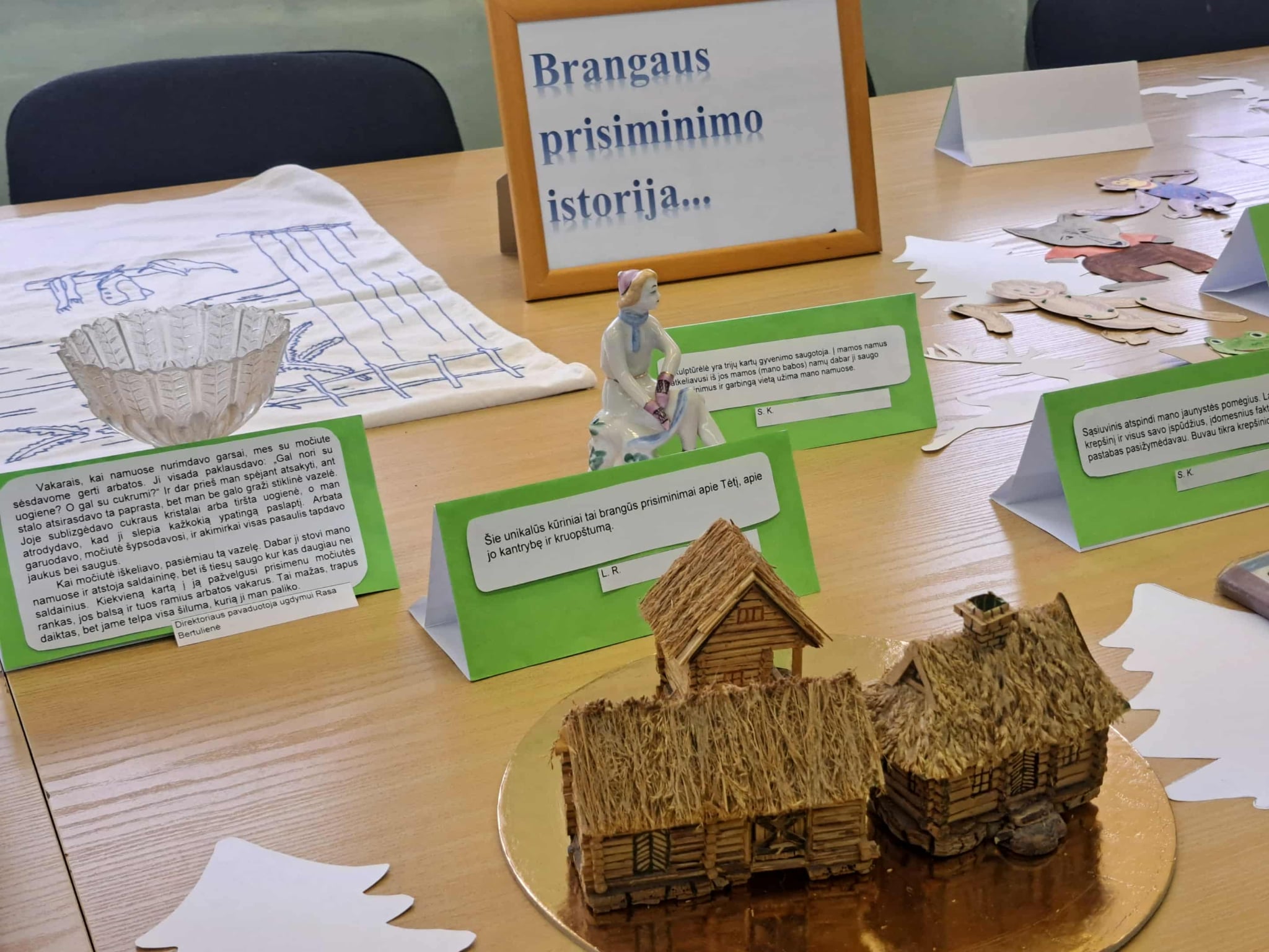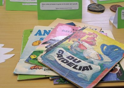 Gimnazijos biblioteka brangių prisiminimų istorijomis pildėsi po truputį. Pirmasis ypatingas daiktas su istorija – lėlė Ramunė, po to mamos rankomis siūti kūdikio drabužėliai, močiutės siuvinėtas kilimėlis, mokinių sveikinimai, vaikų išradingos dovanos, tėčio rankomis kruopščiai sumeistrauti mediniai, šiaudiniais stogais namukai, mokytojos rankomis ir fantazija sukurtas lėlių teatras, vaikystės knygos, atsiminimų sąsiuvinis… Ir čia – tikrai ne visi brangiausi mūsų darbuotojų prisiminimai. Kiekvienas eksponatas ima spinduliuoti šilumą, kai perskaitai jo istoriją…