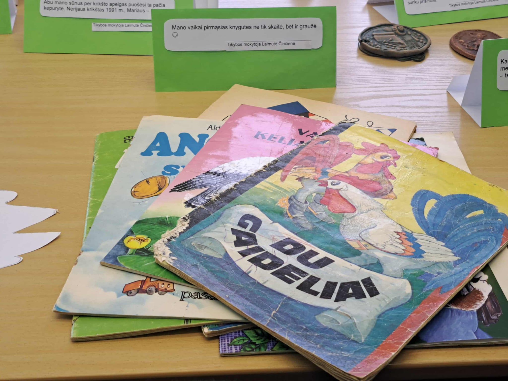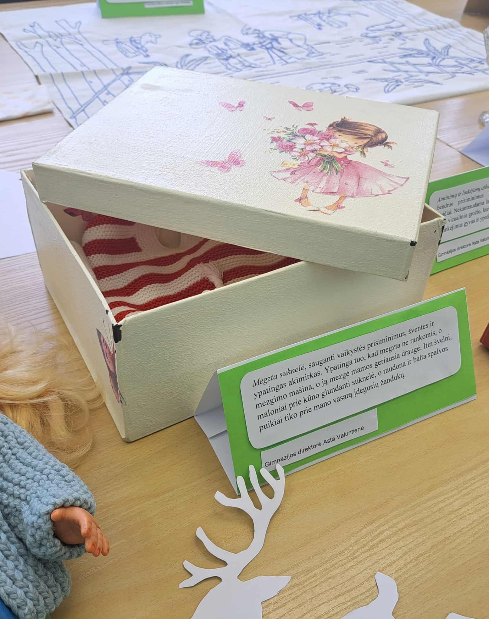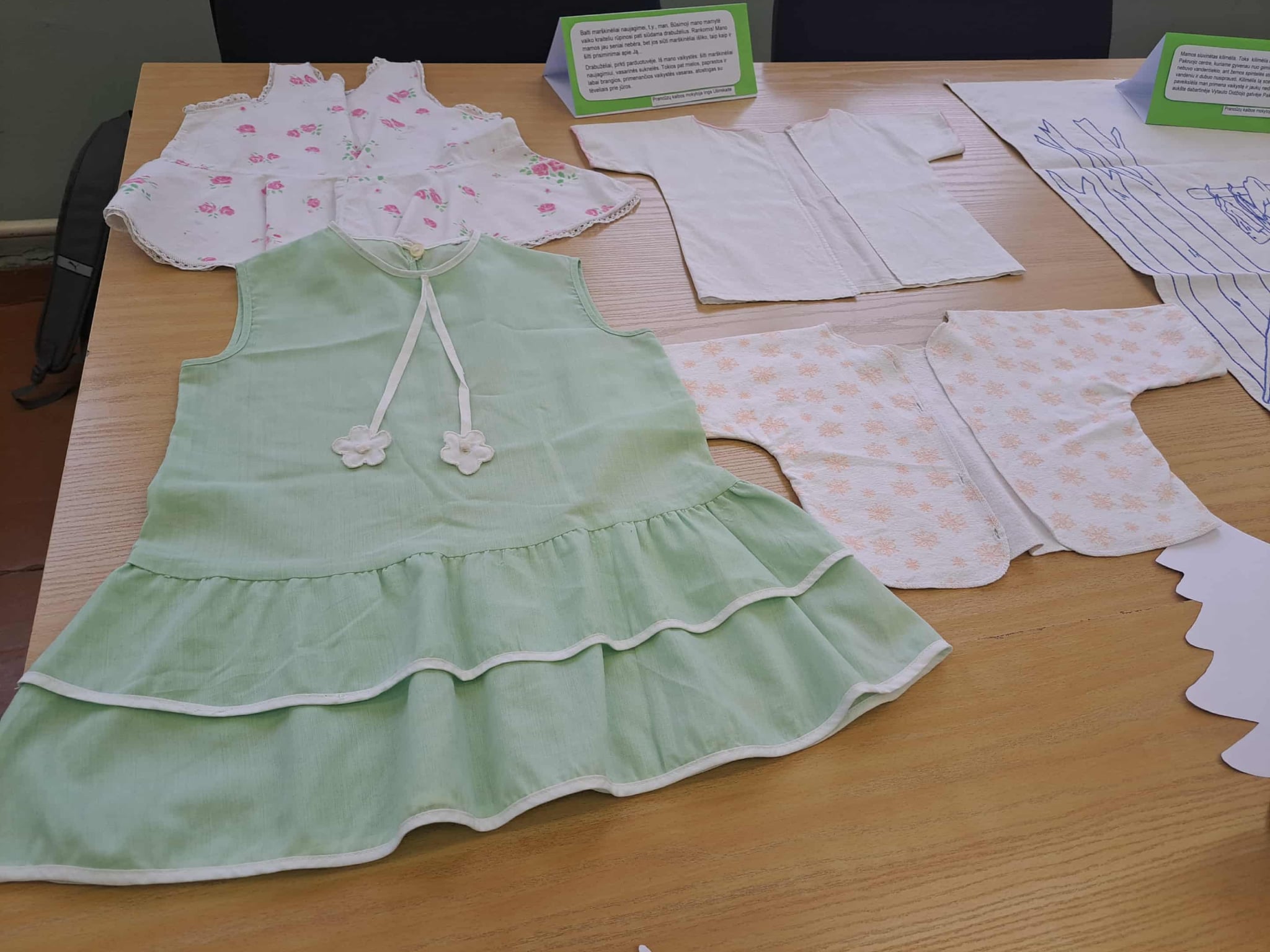 Gimnazijos biblioteka brangių prisiminimų istorijomis pildėsi po truputį. Pirmasis ypatingas daiktas su istorija – lėlė Ramunė, po to mamos rankomis siūti kūdikio drabužėliai, močiutės siuvinėtas kilimėlis, mokinių sveikinimai, vaikų išradingos dovanos, tėčio rankomis kruopščiai sumeistrauti mediniai, šiaudiniais stogais namukai, mokytojos rankomis ir fantazija sukurtas lėlių teatras, vaikystės knygos, atsiminimų sąsiuvinis… Ir čia – tikrai ne visi brangiausi mūsų darbuotojų prisiminimai. Kiekvienas eksponatas ima spinduliuoti šilumą, kai perskaitai jo istoriją…