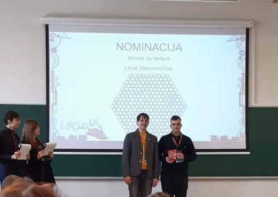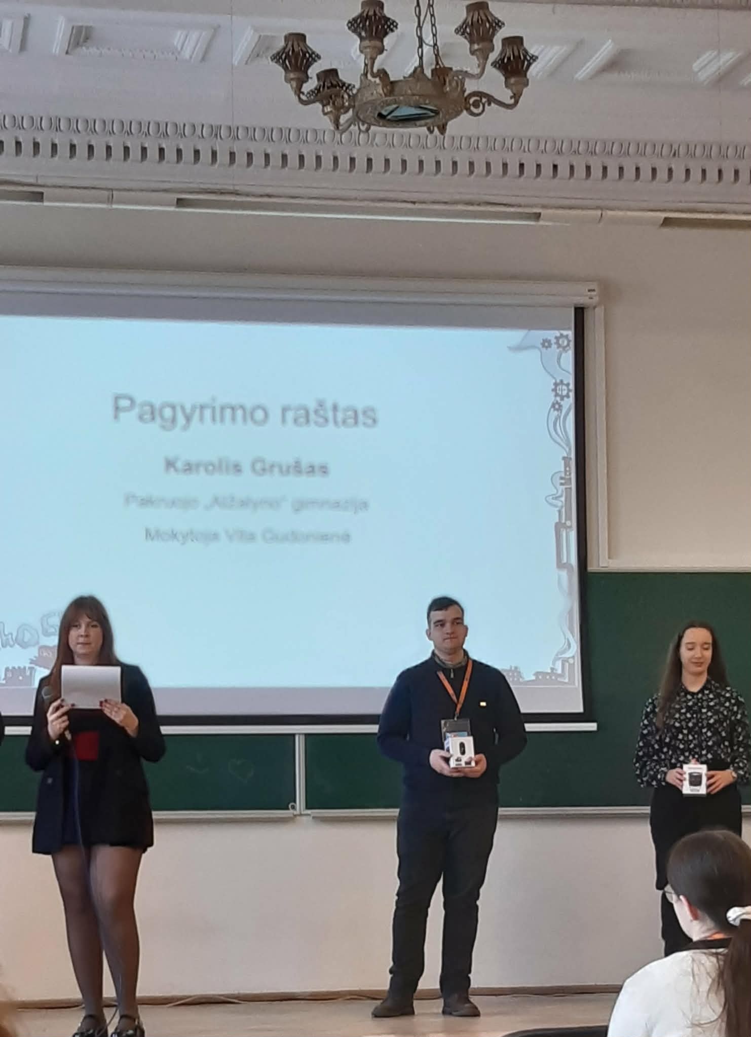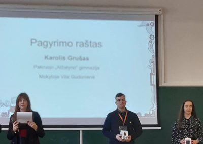 IV c klasės gimnazistas Karolis Grušas vasario 26–28 dienomis dalyvavo chemijos olimpiados šalies etape, kuriame varžėsi geriausi jaunieji chemikai iš visos Lietuvos. Renginys prasidėjo iškilmingu atidarymu ir vertinimo komisijos narių sveikinimais. Komisijos pirmininkas VU Chemijos ir geomokslų fakulteto absolventas Lukas Šteinys, linkėdamas dalyviams puikių rezultatų, tradiciškai sudaužė kolbą, kurios šukės dalyviams neša sėkmę.